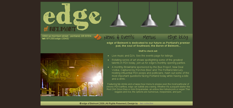 edge of Belmont is a restaurant in SE Portland serving eclectic cuisine. There site features multiple menus and an events calendar, both client controlled. In addition the event calendar automatically removes events after they’ve happened. The site was visually designed by Ben Vanderveen at plus two collective. Since the site launched I’ve helped maintain the site for them.