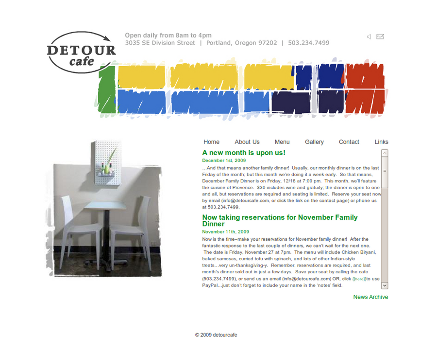 Detour Cafe is a fabulous (I recommend The Boys Upstairs which is a sandwich featuring Italian sausage with roasted onions, melted mozzarella and tomato sauce) cafe in South East Portland that I had the honor of collaborating once again with Emily Steen from Built Studios on for their website. They already had a basic site, but it was slow and hard to update (since it relied on a lot of flash).