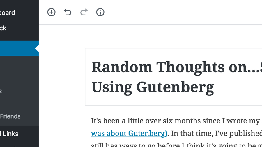 It's been a little over six months since I wrote my first post in Gutenberg (and it was about Gutenberg). In that time, I've published 18 posts using Gutenberg. It still has ways to go before I think it's going to be great, but it's continuously solving my needs on this site. When I originally posted my comments, I posted a mix of ideas, bugs, oooh-moment features, and reactions. Some of them are worth revisiting: