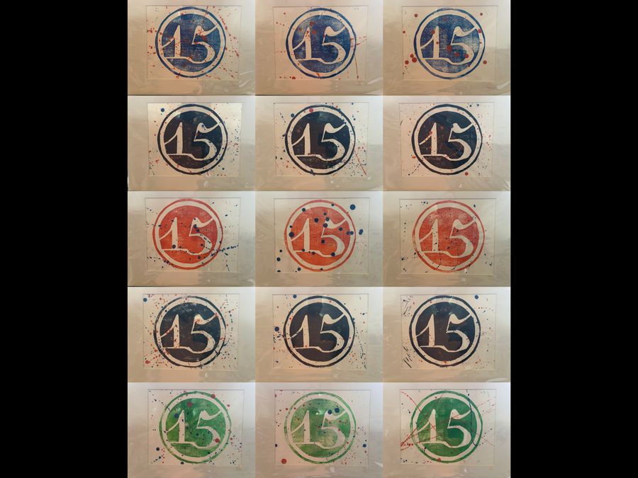 Above you’ll find 15 mono prints I made in celebration of WordPress’s 15th anniversary. Inspired by the WordPress logo, I based the text on Dalliance, Jason Santa Maria’s inspiration for the original W, before cutting the linoleum and making each print. For the Blue, Black, Orange, and Grey, I used printmaking ink. The green is acrylic paint. I then splatter painted till I was happy with the effect. Each print is hand numbered and signed on both the mat and the back of the print.
